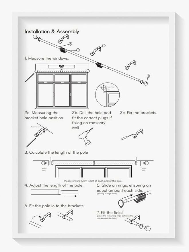 It can be fit perfectly above most windows, without any need for cutting.This set includes two brackets, fixed metal pole with finials, as well as an assembly kit.